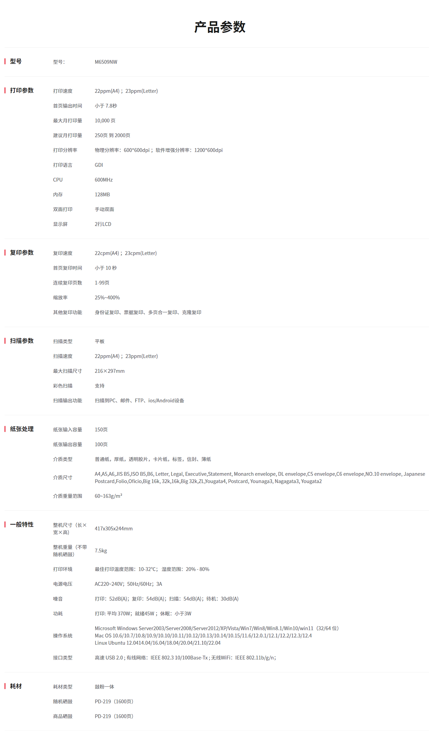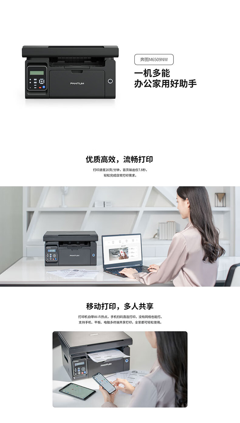 奔图(PANTUM) M6509NW 黑白激光打印机一体机 打印复印扫描 有线+wifi连接