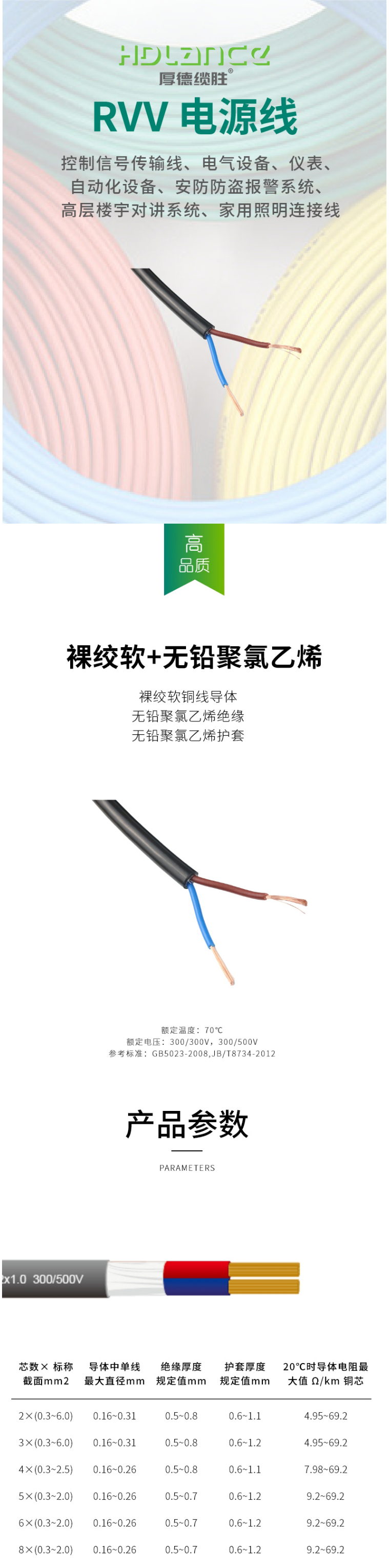 厚德缆胜 RVV2*1.0 电源线200米/卷