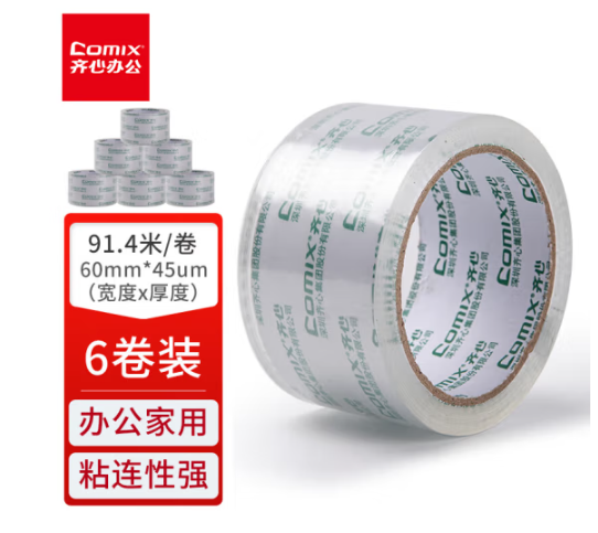 齐心(COMIX) JP6010-6 透明胶带/宽胶带/封箱胶带 快递打包胶带透明 6卷 宽60mm*100y*45um 长91.4米/卷