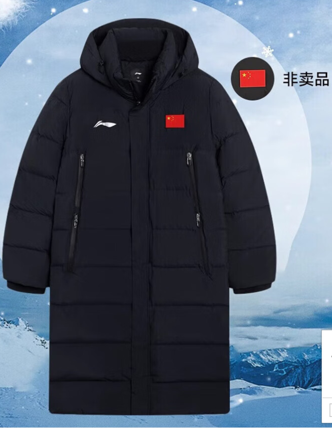 李宁(LI-NING) AYMU343-1L羽毛球队国旗版白鸭毛运动羽绒服,防风保暖长款连帽面包服 黑【85%鸭绒男女长款
