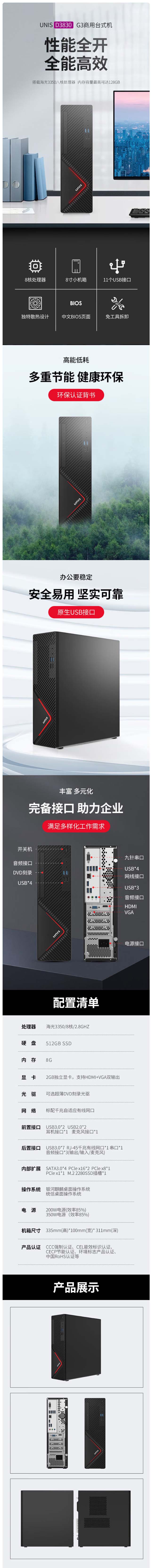 紫光(UNIS) D3830 G3 海光3350八核处理器 16G内存 512G+1T 独显2G 商用台式电脑 主机+23.8英寸高清显示器
