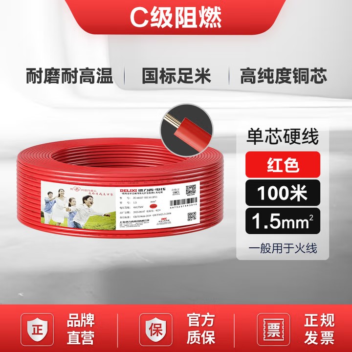 德力西 ZC-BV1.5平方阻燃单芯单股家用铜芯电线100米