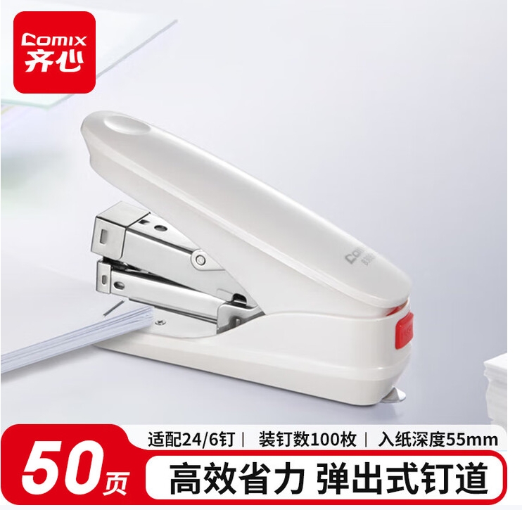 齐心(COMIX) 50页省力订书机/订书器 可装订25页防卡钉功能 适配24/6 弹出式钉道 办公用品 珠光白B3088