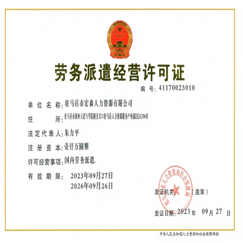 驻马店市宏森人力资源有限公司,成立于2023-04-20,注册资本为500万人民币,法定代表人为朱力平,经营状态为存续,工商注册号为91411700MACELMW180,注册地址为驻马店市创业大道与学院路交叉口驻马店人力资源服务产业园2层A206室,经营范围包括一般项目:人力资源服务(不含职业中介活动、劳务派遣服务);家政服务;会议及展览服务;礼仪服务;普通货物仓储服务(不含危险化学品等需许可审批的项目);劳务服务(不含劳务派遣);接受金融机构委托从事信息技术和流程外包服务(不含金融信息服务)(除依法须经批准的项目外,凭营业执照依法自主开展经营活动)许可项目:道路货物运输(不含危险货物);职业中介活动;建筑劳务分包;劳务派遣服务(依法须经批准的项目,经相关部门批准后方可开展经营活动,具体经营项目以相关部门批准文件或许可证件为准) 。