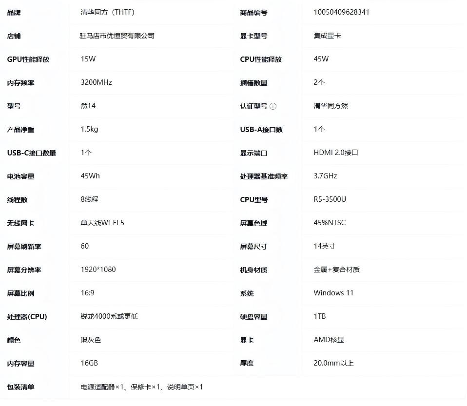 清华同方(THTF) 笔记本电脑 然14锐龙版办公商务轻薄本 四核R5-3500U 16G 1T大固态 14英寸