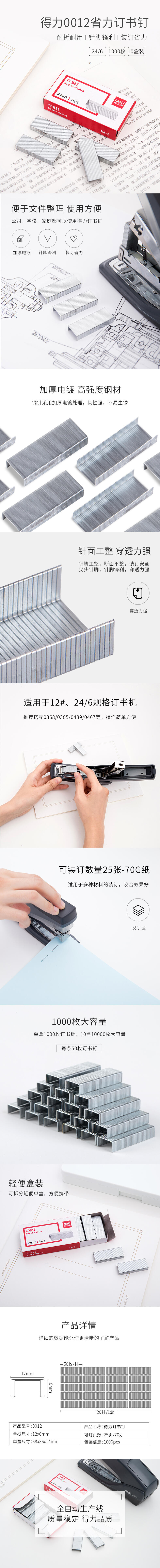 得力(deli) 高强度24/6订书钉 12号订书针 1000枚/盒 单盒装 可订20页 办公文具用品 0012