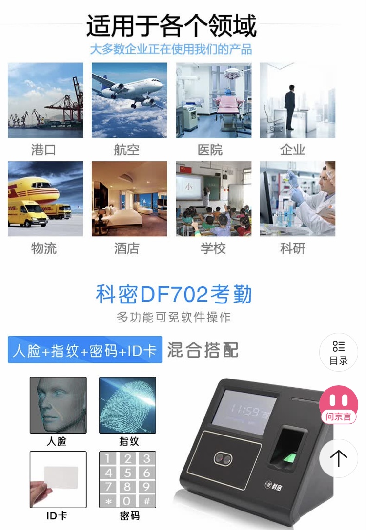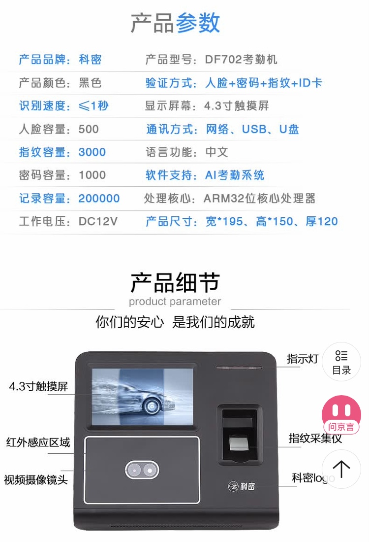 科密 人脸指纹混合识别考勤机 无接触考勤门禁一体机 WIFI网络打卡机 自动生成报表DF702新款人脸+指纹+密码WIFI连接