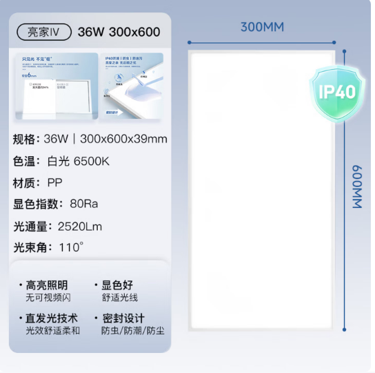 佛山照明(FSL) led集成吊顶灯面板灯全塑窄边 300*600 36W白光 铝扣式