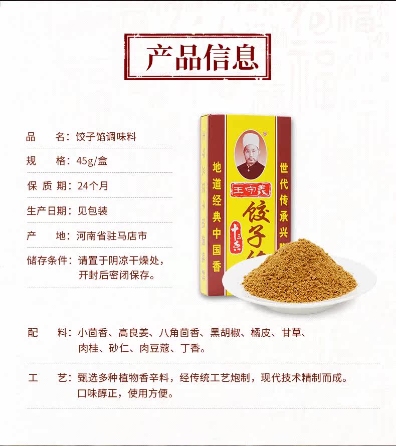 • 商品名称:王守义 十三香饺子馅45g/盒